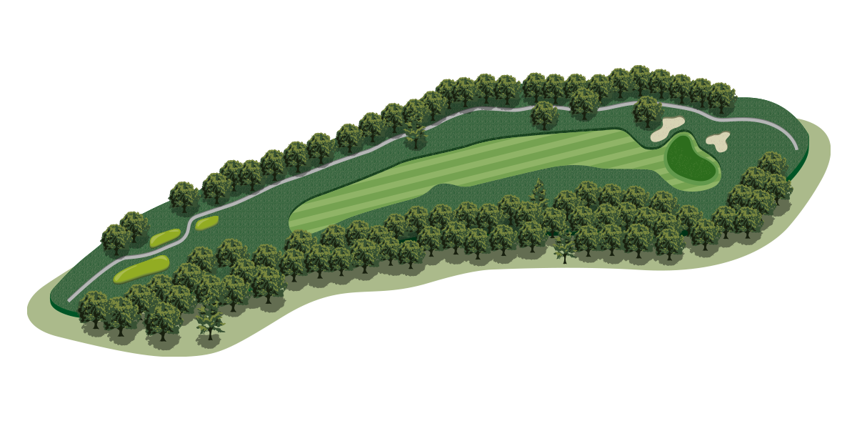 四桿洞,略向右狗腿。瞄準球道的中心或左側。綠色位置稍低。