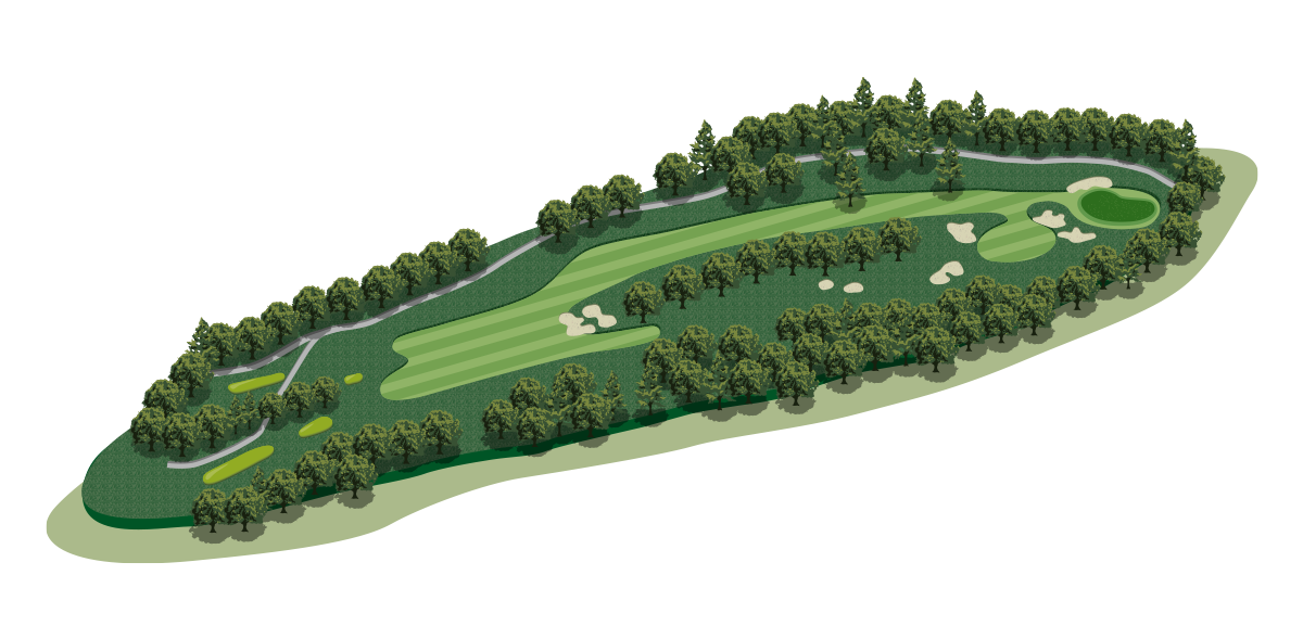 중요한 구멍입니다. 분리된 페어웨이 파 5. 왼쪽 루트가 더 넓고 평평합니다. 왼쪽을 유지하세요. 치핑 영역에도 기복이 있습니다.
